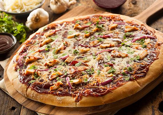 Tangy BBQ sauce is topped with mozzarella cheese, tender chicken, sweet red onions and fresh cilantro. Our dough is made fresh daily with enriched flour, followed by our thick, rich pizza sauce mixed with our own special herbs and spices.